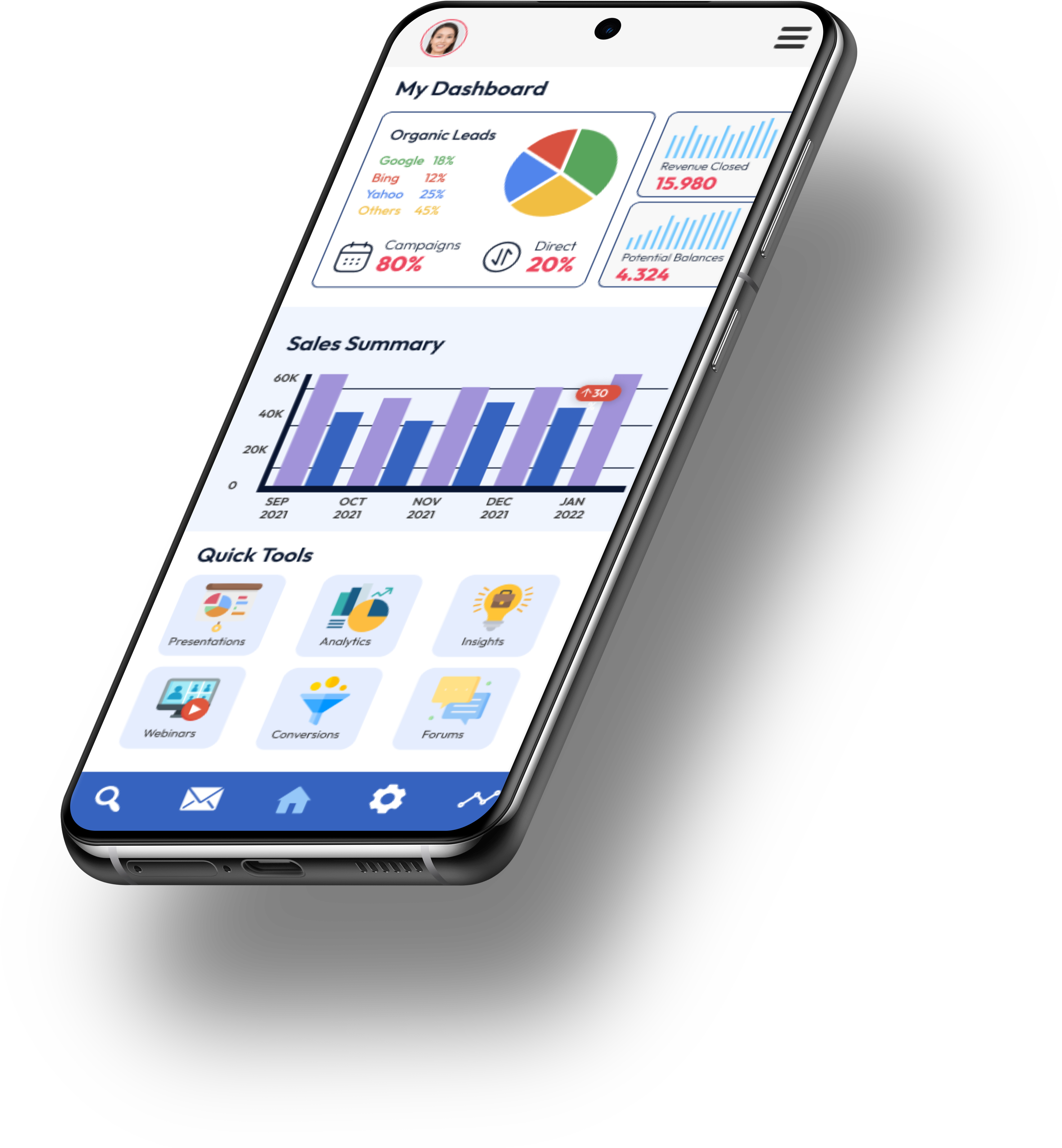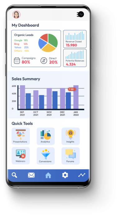Conduct presentations, organize webinars, convert acontact to leads, stay ahead of the numbers, never lose track of sales and performance metrics, even while you are away. Our blended dashboards ensure you are always ahead of the curve.